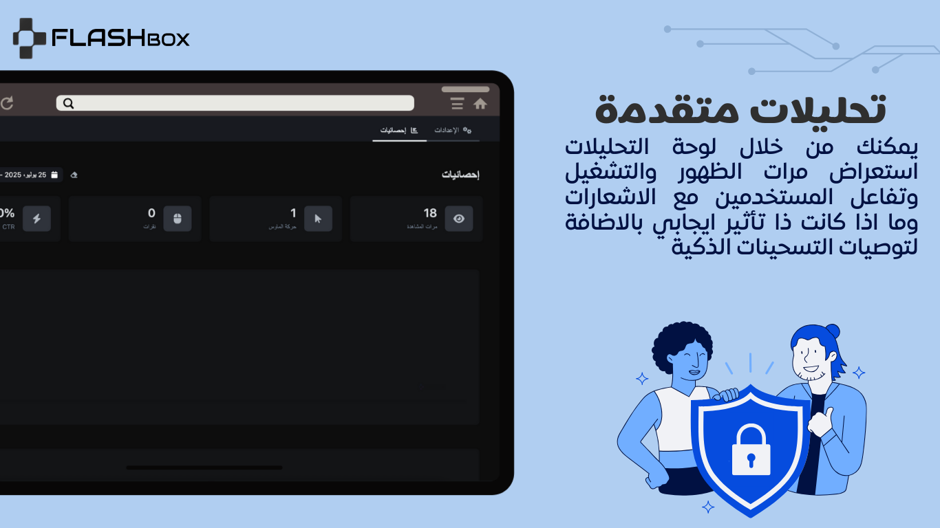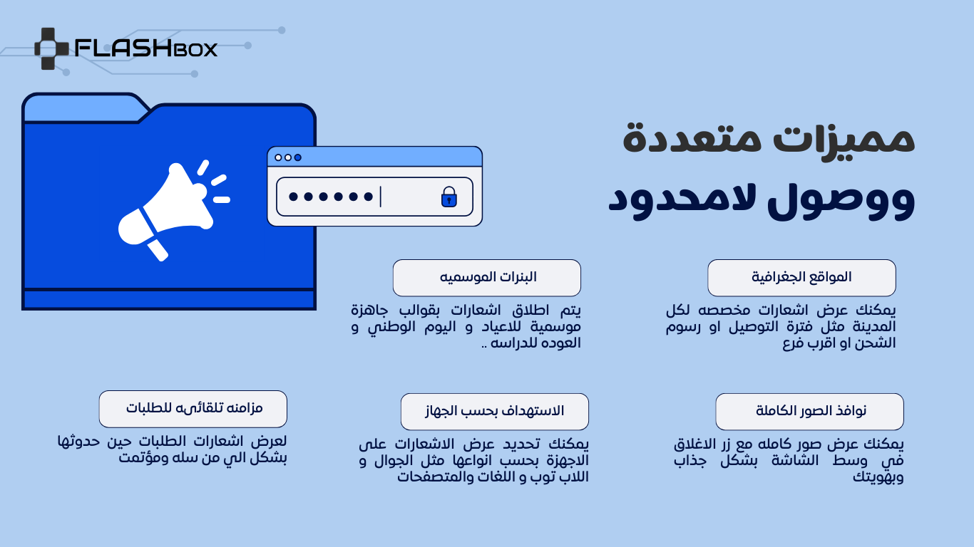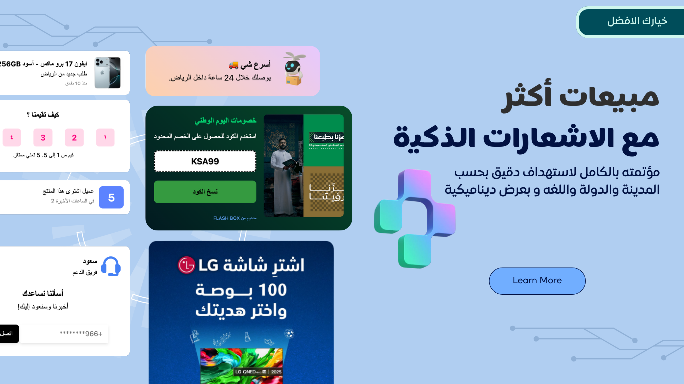 ارفع مبيعات متجرك وحسّن تجربة الزوار مع فلاش بوكس — نظام إشعارات ذكي يزيد التفاعل والتحويل داخل متاجر سلة مع تخصيص كامل وتحكم ذكي، ويمنحك أدوات تسويق فورية متوافقة مع هوية متجرك.