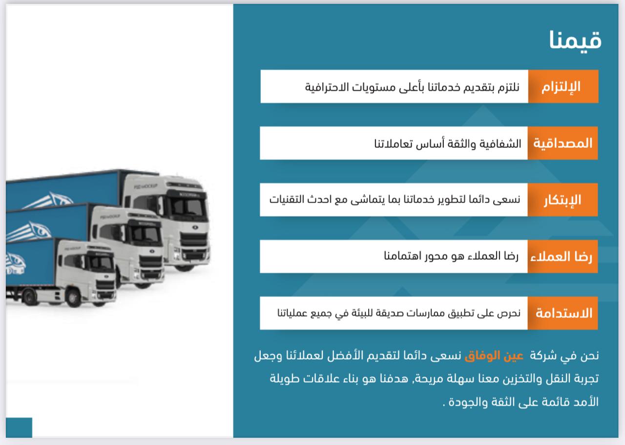 عين الوفاق شركة نقل رائدة تعمل في المملكة العربية السعودية, متخصصون في تقديم خدمات متكاملة تشمل النقل والتخزين. نهدف إلى تلبية احتياجات عملائنا من خلال تقديم حلول نقل فعالة وآمنة تلبي أعلى معايير الجودة. تأسست شركتنا على أسس من الثقة والإحترافية, مما يجعلنا شريكا موثوقا به لعملائنا نهدف لخدمة عمل...