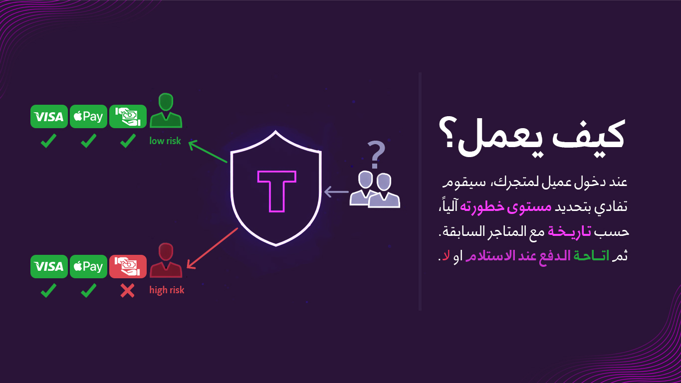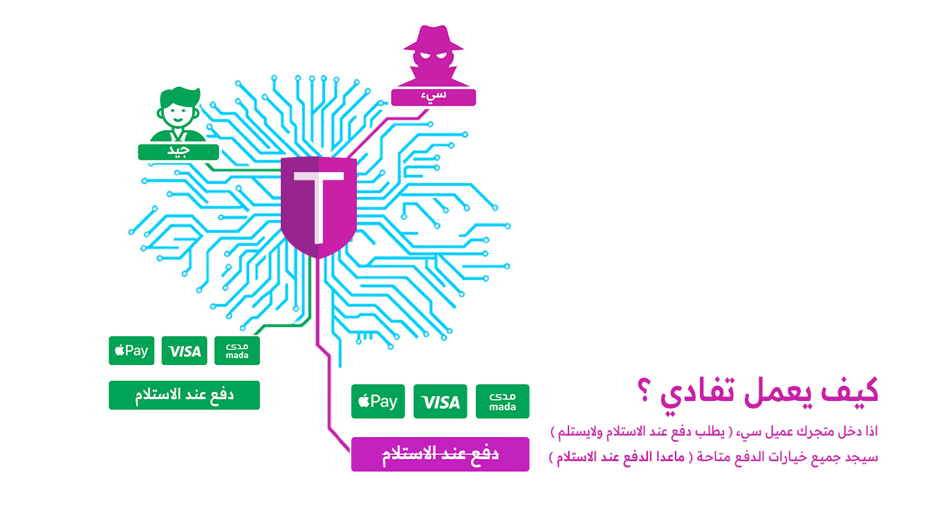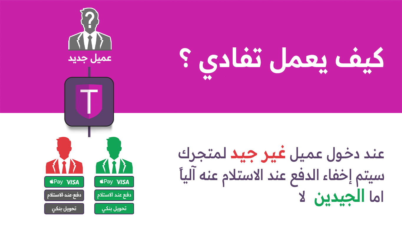 تفادي هو رجل أمن الكتروني يقف على باب متجرك ، يتأكد من العملاء لحضة بلحضة، وان وجد ان العميل الذي دخل متجرك لديه تاريخ غير جاد ويطلب دفع عند الاستلام ولايستلم ، سيقوم عندها تفادي بإخفاء الدفع عند الاستلام فقط اما باقي خيارات ال...