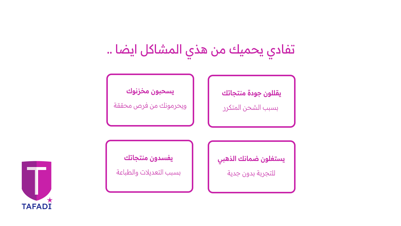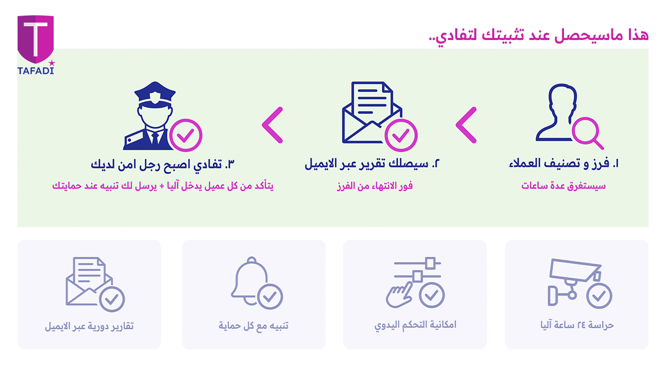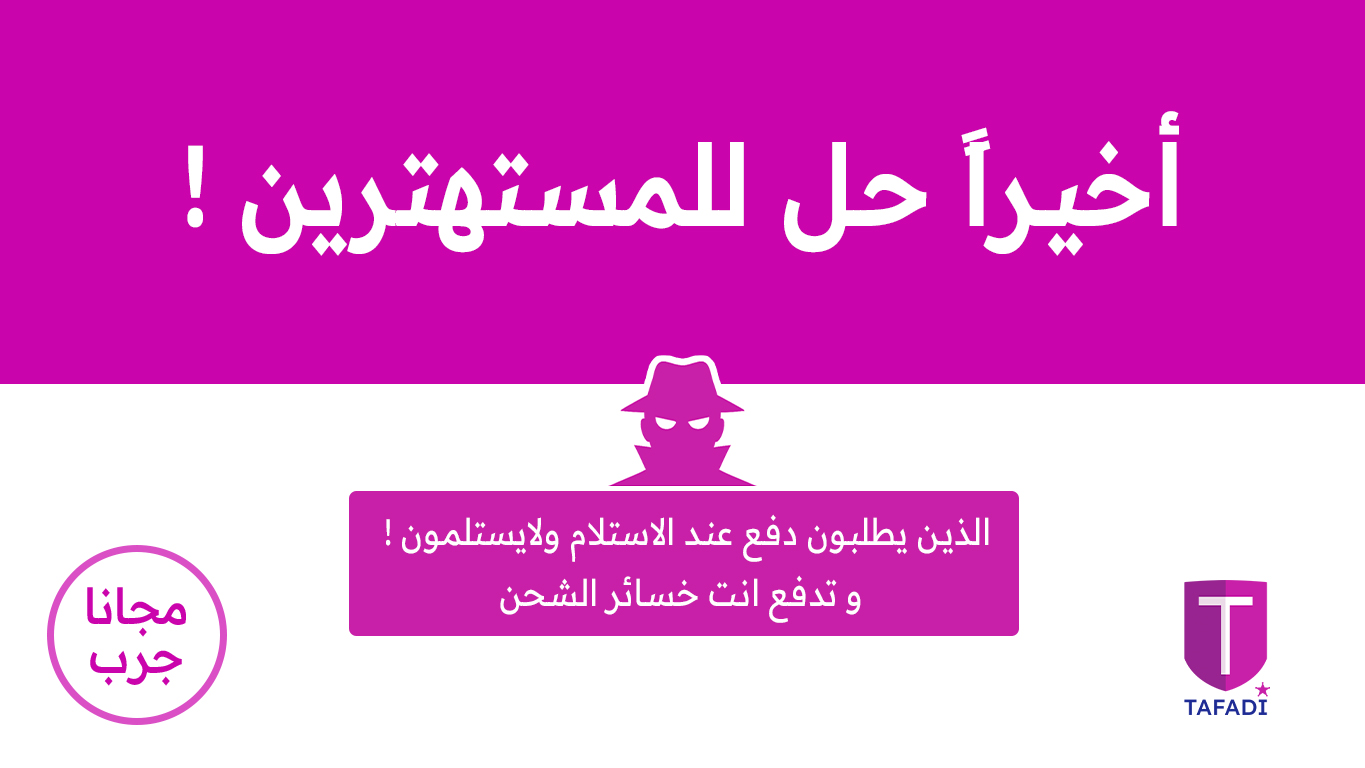 تفادي هو رجل أمن الكتروني يقف على باب متجرك ، يتأكد من العملاء لحضة بلحضة، وان وجد ان العميل الذي دخل متجرك لديه تاريخ غير جاد ويطلب دفع عند الاستلام ولايستلم ، سيقوم عندها تفادي بإخفاء الدفع عند الاستلام فقط اما باقي خيارات ال...