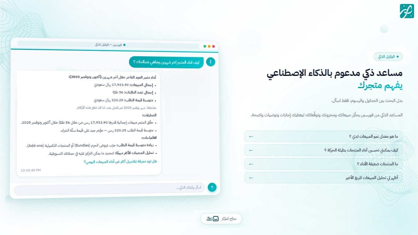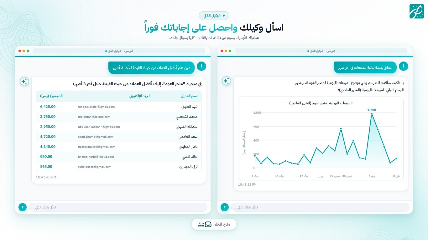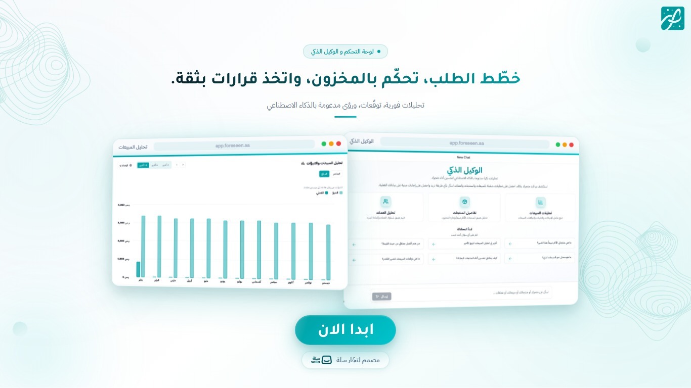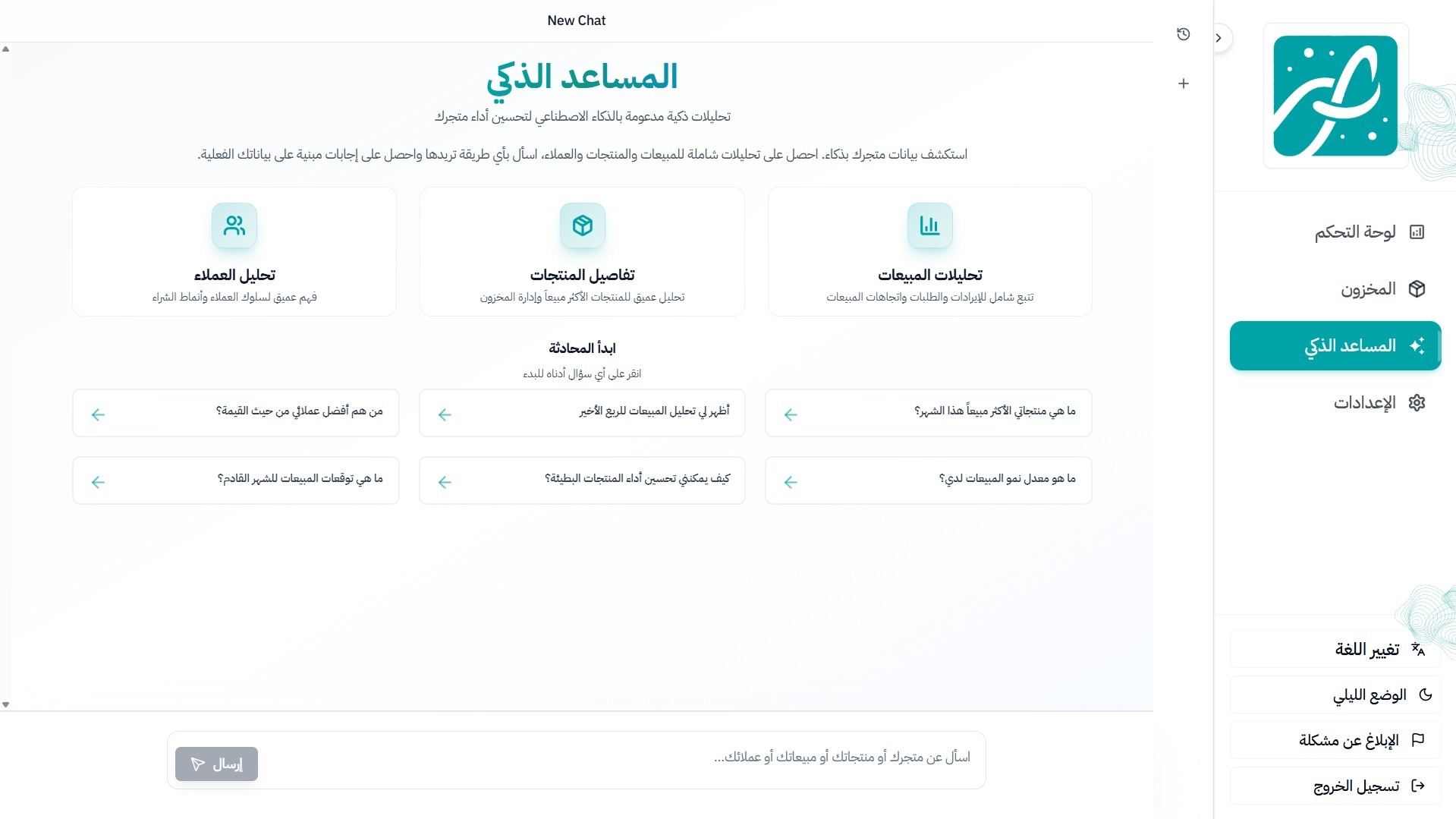 محلل بياناتك الخاص، داخل متجرك. اسأله أي سؤال عن المبيعات أو المخزون واحصل على إجابات ذكية وتوصيات عملية.