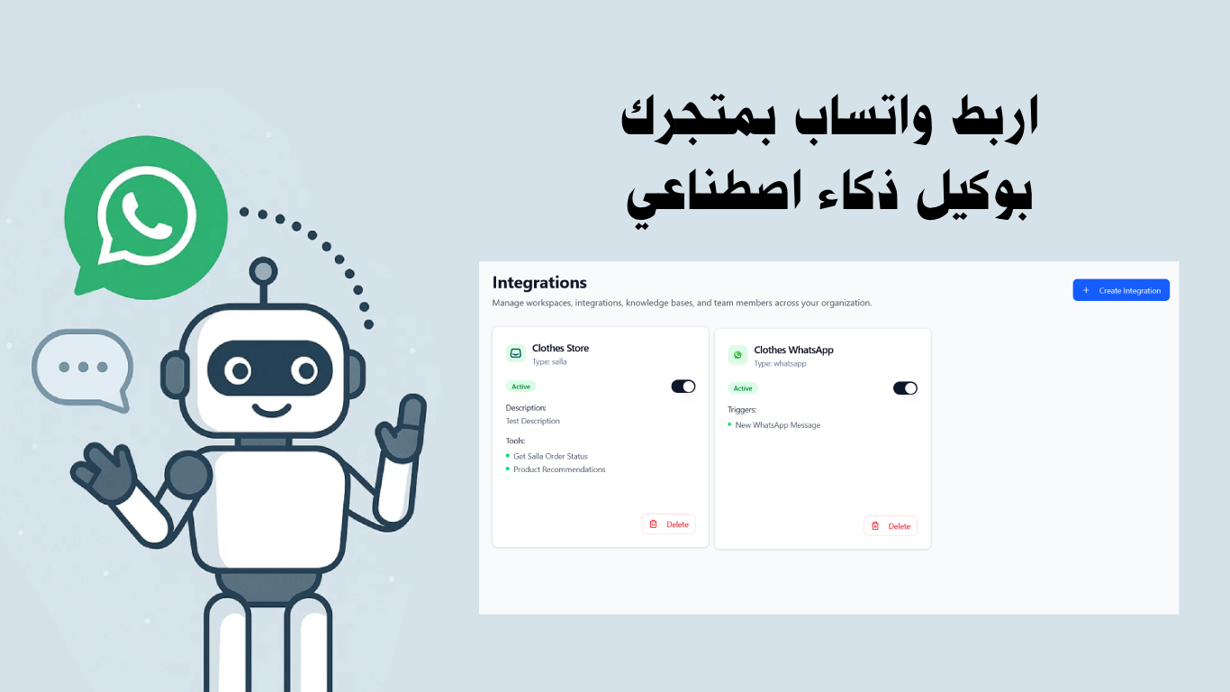 تريجز يسهّلها عليك يا طويل العمر: تربط واتساب بمتجرك في سلّة، ترفّع ملفاتك (كتالوج، أسئلة شائعة، سياسات)، والوكيل الذكي يردّ على عُملاءك على طول، بأسلوب عربي طبيعي ومرتب.