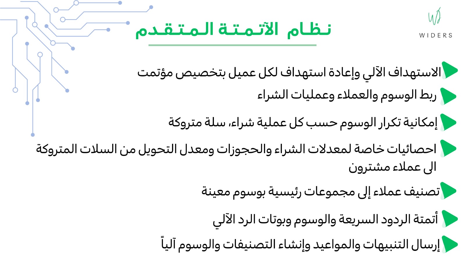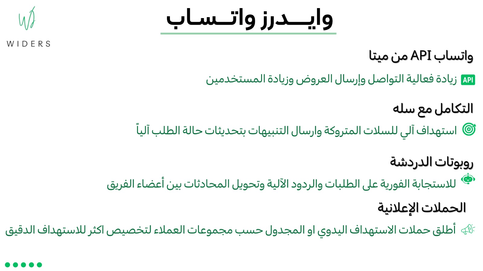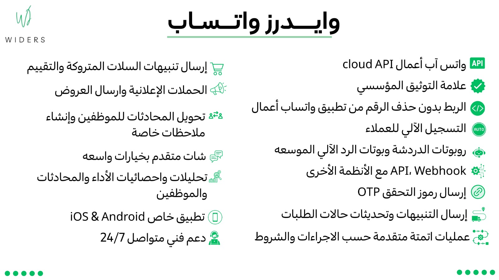 يوفر وايدرز واتساب إمكانية التواصل مع عملائك بدون حدود وارسال التنبيهات والإشعارات آلياَ حسب تغير حالة الطلب