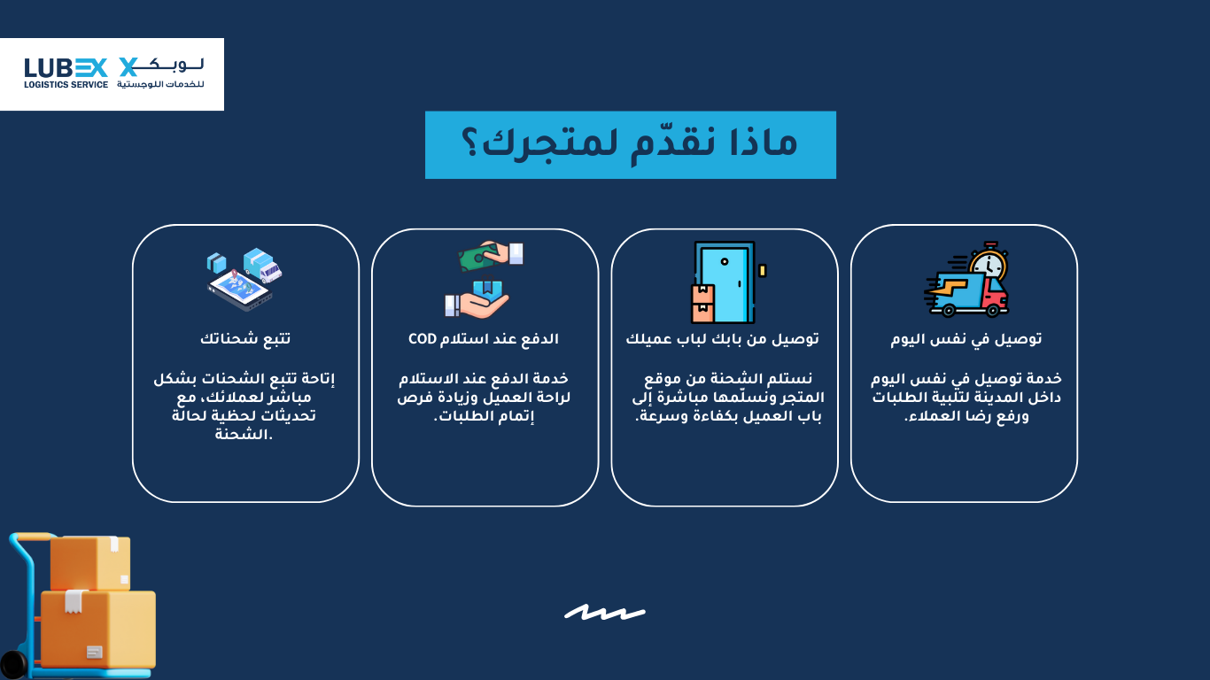 لوبكس هي شركتك الموثوقة لشحن ودعم المتاجر الإلكترونية، حيث نوفر خدمة توصيل سريعة وآمنة داخل الرياض خلال 4 ساعات فقط، بسعر يبدأ من 14 ريال للشحنة.