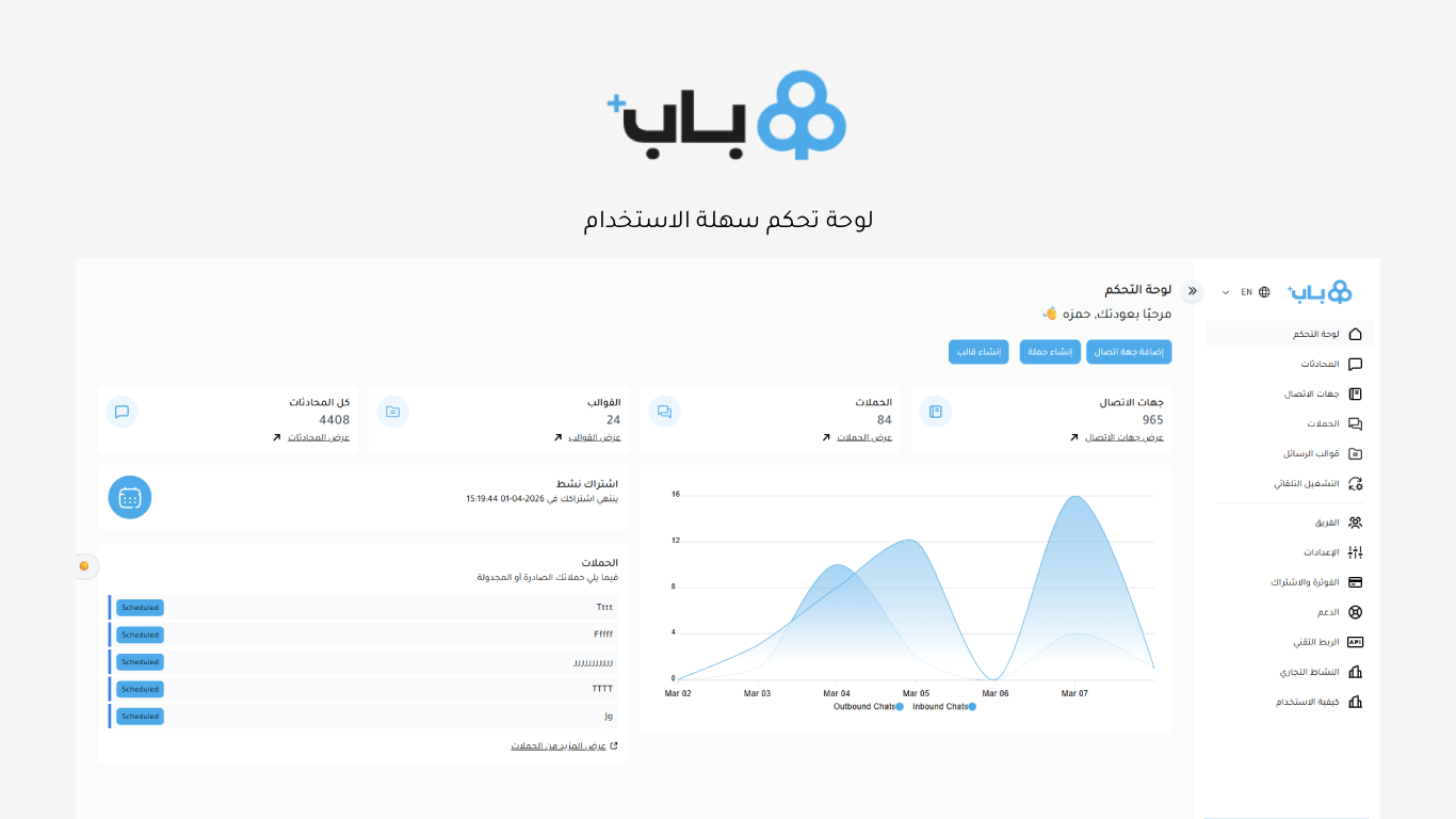باب بلس هو تطبيق متكامل لمتاجر سلة يساعدك على أتمتة التواصل مع العملاء عبر واتساب، تنظيم خدمة العملاء، وزيادة مبيعات متجرك بسهولة.
