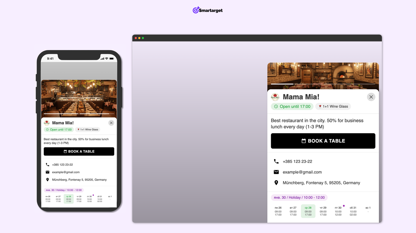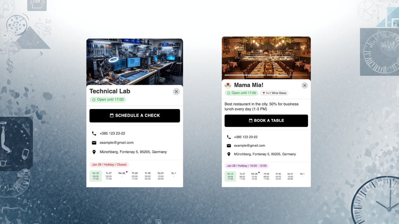 يعرض لك لوحة عائمة توضح حالتك الحالية (مفتوح أو مغلق) حسب الساعات اللي تحددها، بحيث...