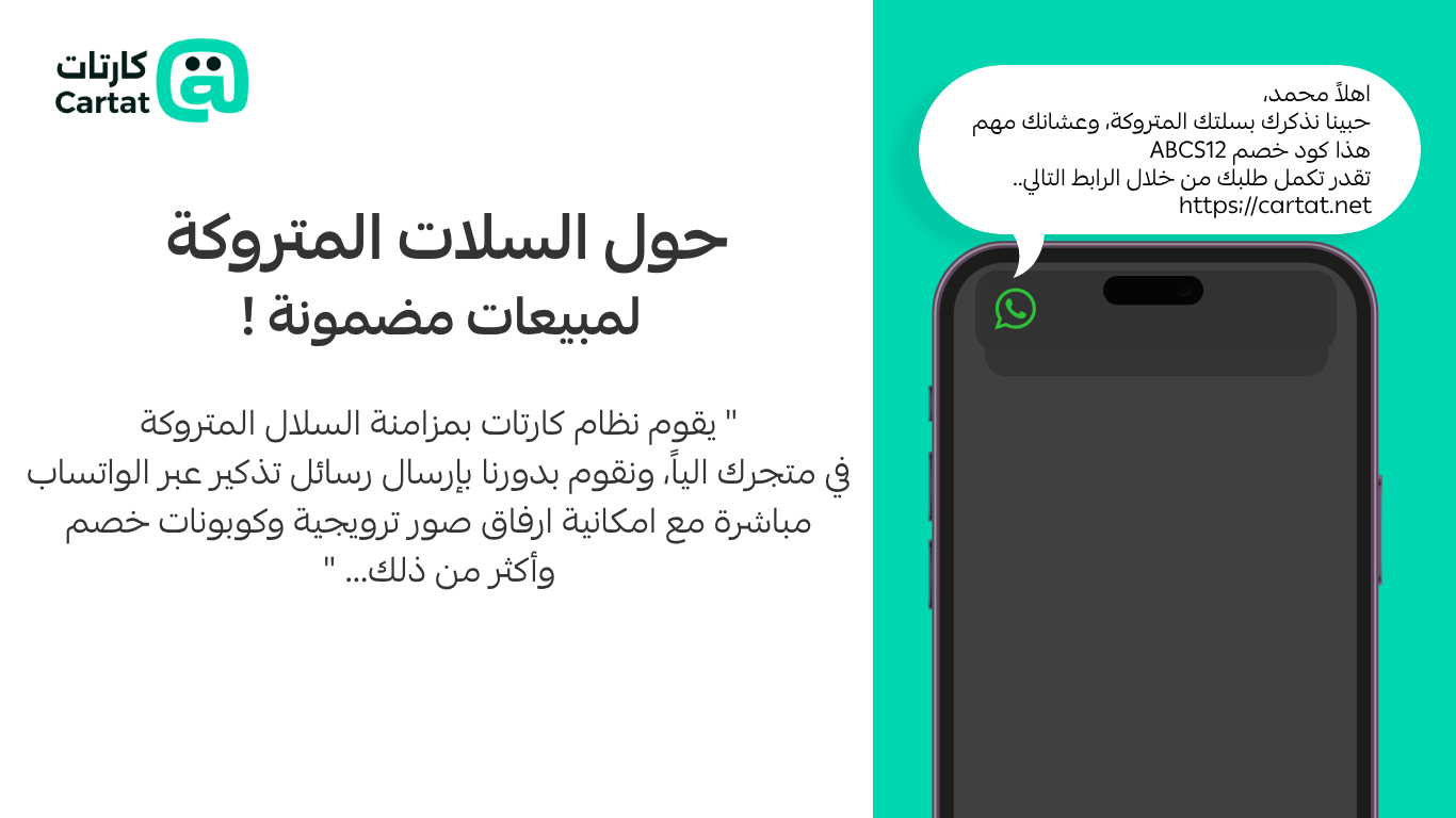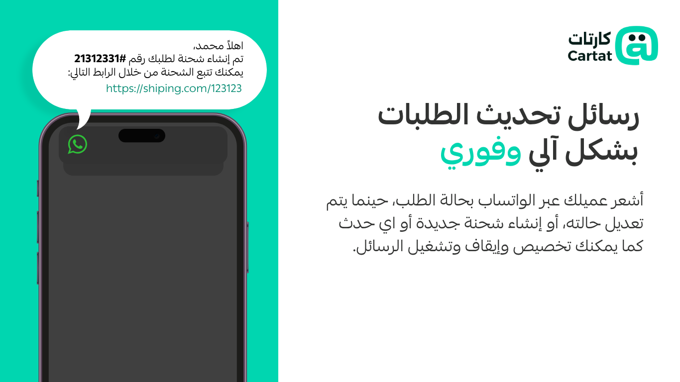 خدمة الواتساب الأكثر موثوقية من قبل التجار، نذكر عملائك بسلاتهم المتروكة، ونرسل لهم التحديثات المتعلقة بطلباتهم، و نساندك في الردود الآلية، كل ذلك عبر الواتساب بشكل آلي وبعدة نقرات فقط.
